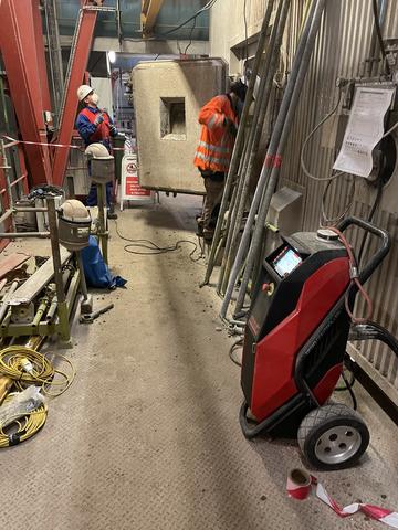 The team used an Aquajet Ergo ultra-high pressure jetting frame operating at 2200 bar (32,000 psi) with a water flow of 90 litres per minute to remove the refractory, a highly heat resistant material used to line the combustion chamber.