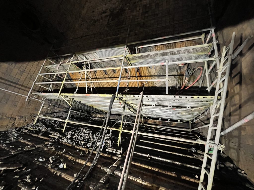 Hydroblast’s client, an engineering maintenance contractor, had erected scaffolding to Hydroblast’s specification. The Aquajet Ergo frame was attached to this scaffolding with the water jets located 50mm from refractory surface.