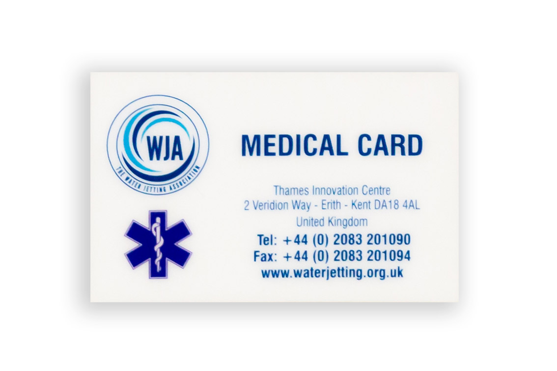 Credit card size to fit in wallet to be carried at all times. Gives basic details of the medical treatment for Water Jet Injuries and precautions to be taken to combat the possible effects of the injection of contaminated water into the body and is required by medical staff in the first instance prior to any treatment.